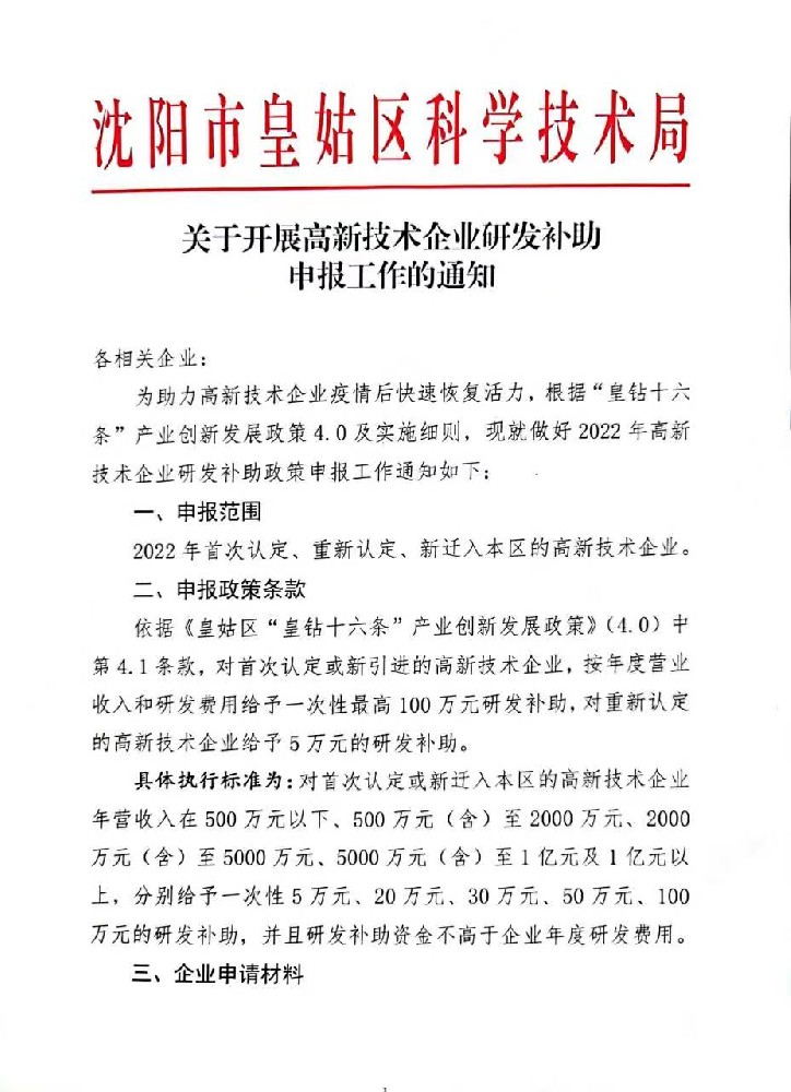 关于开展高新技术企业研发补助申报工作的通知